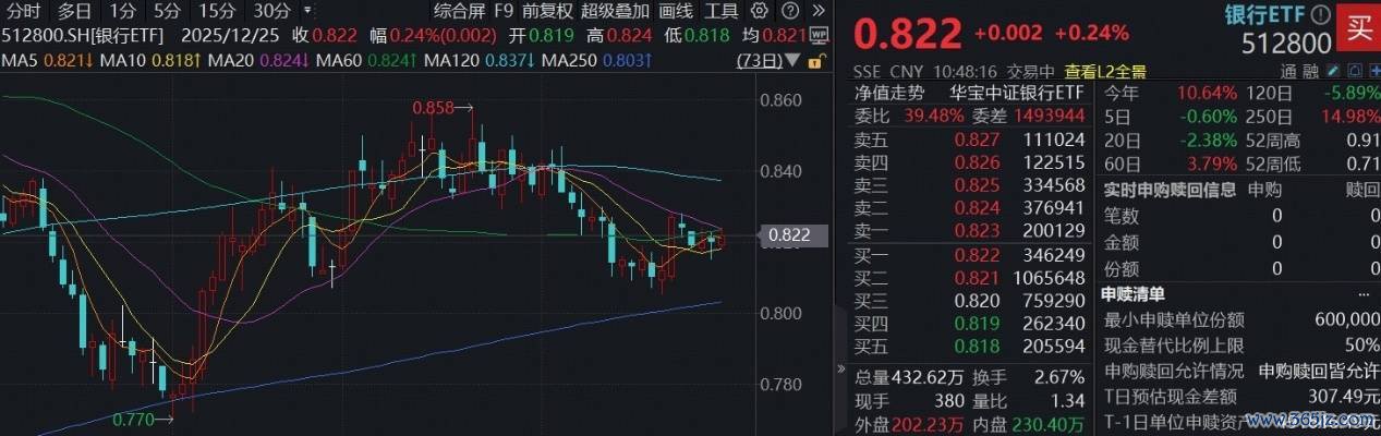 12月25日,银行板块小幅回暖,个股多量飘红,铁心发稿,瑞丰银行涨超2%,光大银行、中信银行、上海银行等涨幅居前。全商场范围最大的银行ETF(512800)场内价钱现涨0.24%,站上5日线。