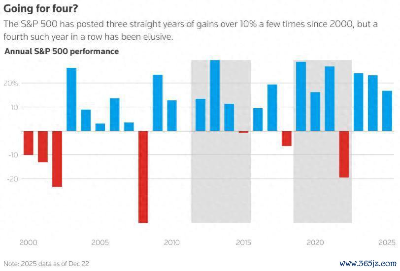 智通财经APP获悉,好意思国股市接续第三年完了两位数百分比涨幅。2026年要完了第四个光泽年份可能难度很大,这需要强盛的企业盈利、好意思联储保握鸽派态度以及东说念主工智能边界的猖狂投资。